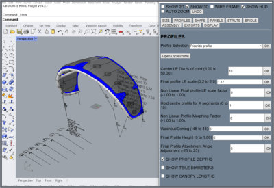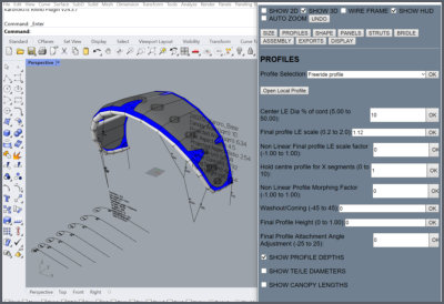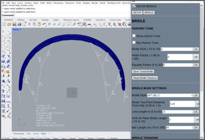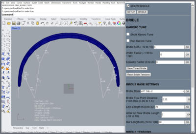 For the design of modern SLE style kitesurfing kites KaroroKITE is the first of a new generation of kite design tools.Running within Rhino3D, KaroroKITE features an easy to understand user interface making it quick to access all the parameters needed to define your kite.By leveraging the power of Rhino3D as its 3D engine, KaroroCAD features mathematically accurate, NURBs based surfacing (not meshes). This leads to all parts being close fit with no post processing or fit factors required in the design process.AI based Bridle tuning - KaroroKITE bridles are developed using a very powerful Physics Simulation engine linked to an AI based search algorithm. Allowing the designer to set a smooth distribution of loads and leveraging the power of modern computing to discover the best solution.